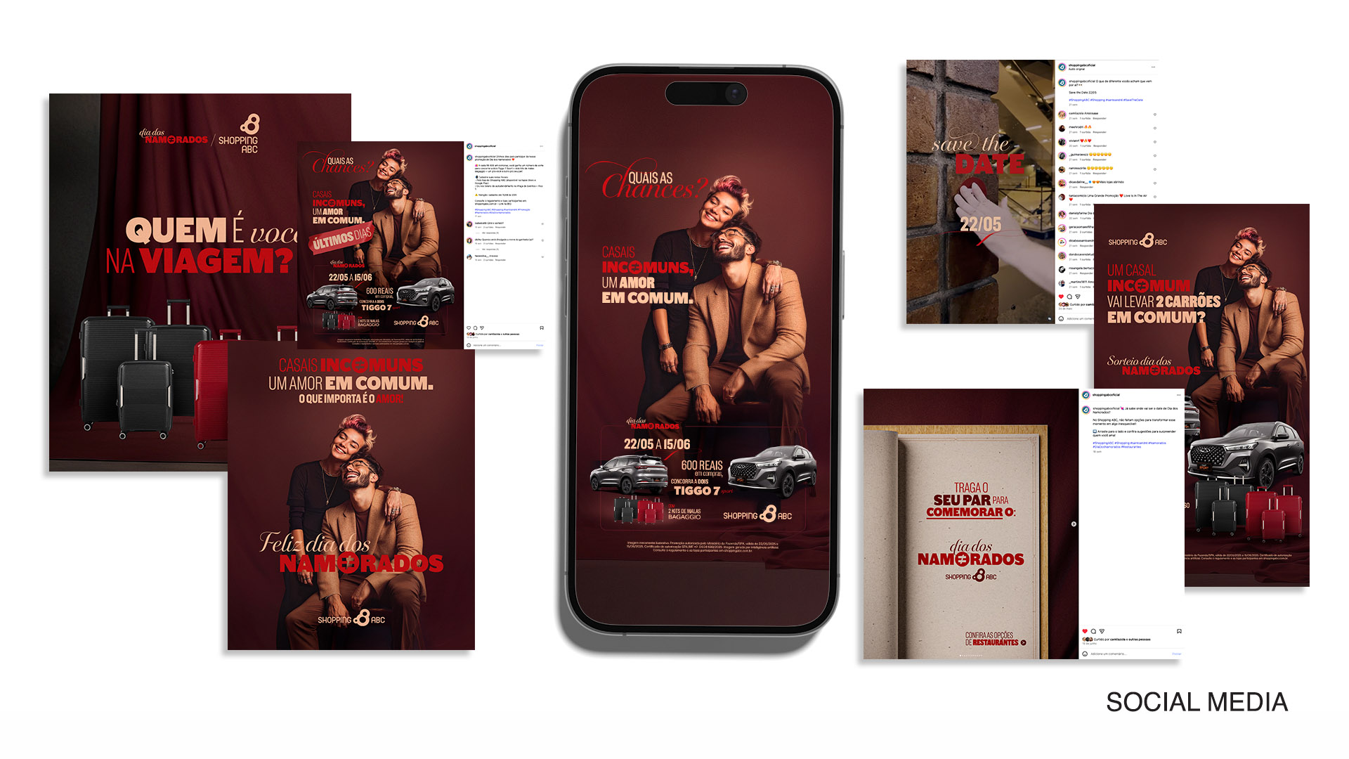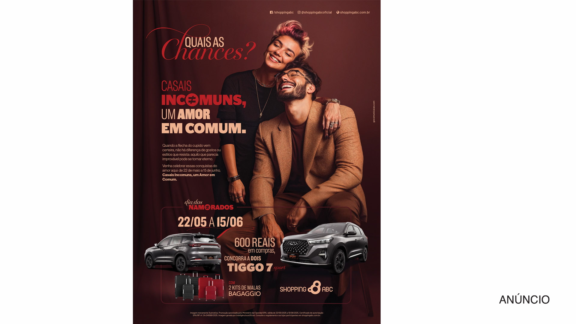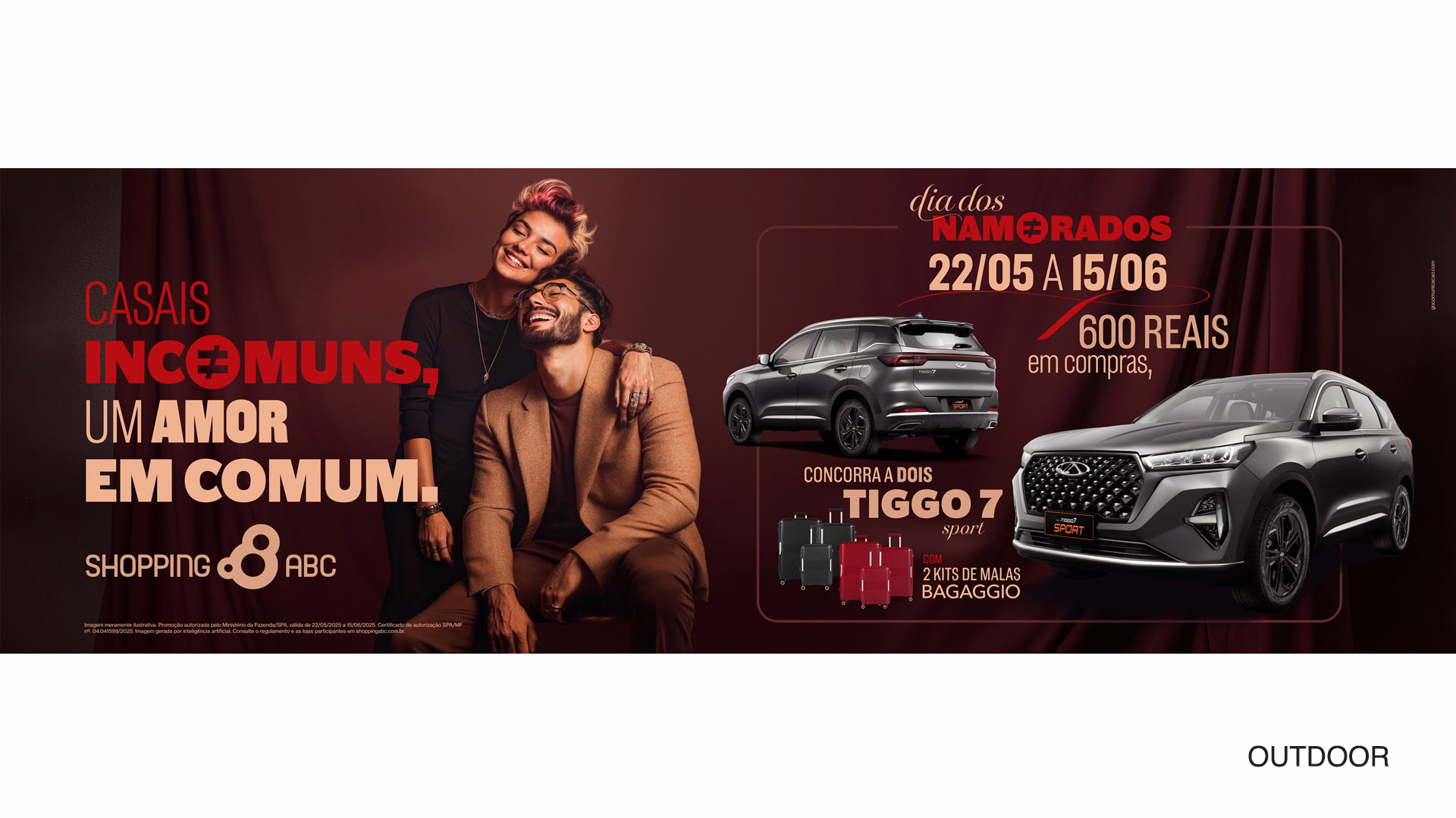 Para enaltecer essas combinações improváveis, criamos o conceito “Casais Incomuns, Um Amor em Comum” uma verdadeira celebração ao Dia dos Namorados. A campanha traz um moodboard alinhado com o universo da moda, com modelos que, mesmo posando, trazem espontaneidade para a cena. Os tons quentes entregam elegância, sobriedade, sensualidade e paixão. Para reforçar o contraste dos casais, a tipologia apostou na contraposição entre o brutalismo de uma fonte black e a leveza e romantismo das fontes manuscritas, lembrando mais uma vez que o amor é capaz de unir tudo. Mantendo a tradição, a promoção sorteou dois carros modelo Tiggo 7 para o mesmo casal, além de dar um par de kits de malas Bagaggio.